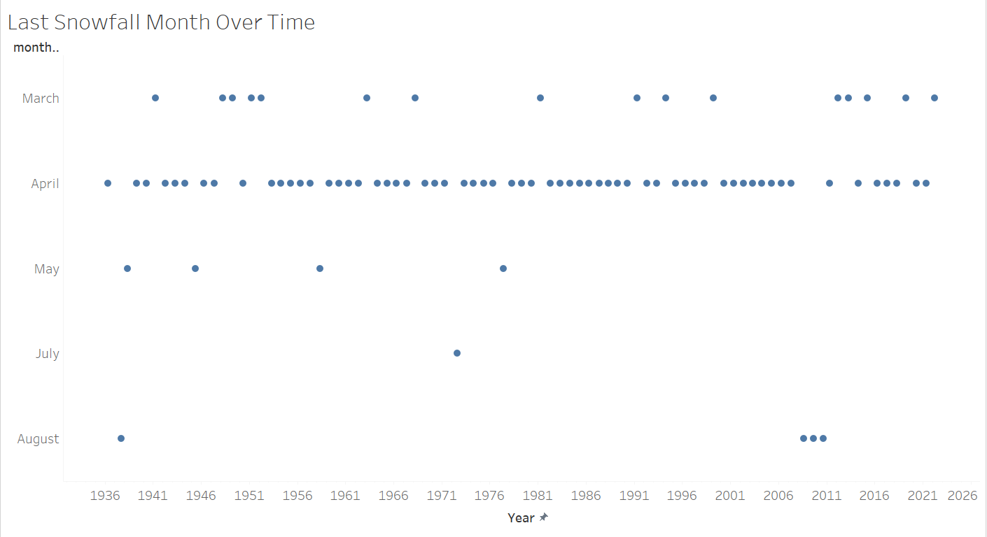 Finally, to see if the start or end of the snowfall season has moved, I made a box plot for each, listing the months of a year in the graph rows and the date of first or last snowfalls in the columns. These days were extracted by creating a calculated field that returned the date of all dates where the first-snow or last-snow Boolean columns were listed as True. I then filtered out months that had no first or last snowfall dates to make them visually easier to interpret. The first snow plot shows almost all years since 1936 having their first snow fall into November, with the occasional start in October every few years. Only twice does it dip as far late as December until the late 90s, when the start of the season begins to vary. Recent years are starting to regularly see snowfall start in December, and from 2013 this has been the case every other year. On the other end of the season, it still seems that snowfall stops in April, though within the past decade there seem to be more frequent, earlier ends to the season in March. This would imply that snow-friendly temperatures are beginning to lift earlier in the year – contracting our winter season on both ends of the spectrum, though with a slower shift on the spring-half of the season.